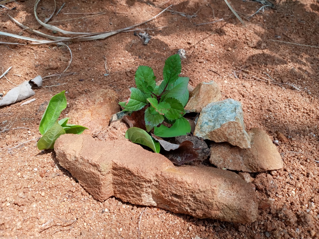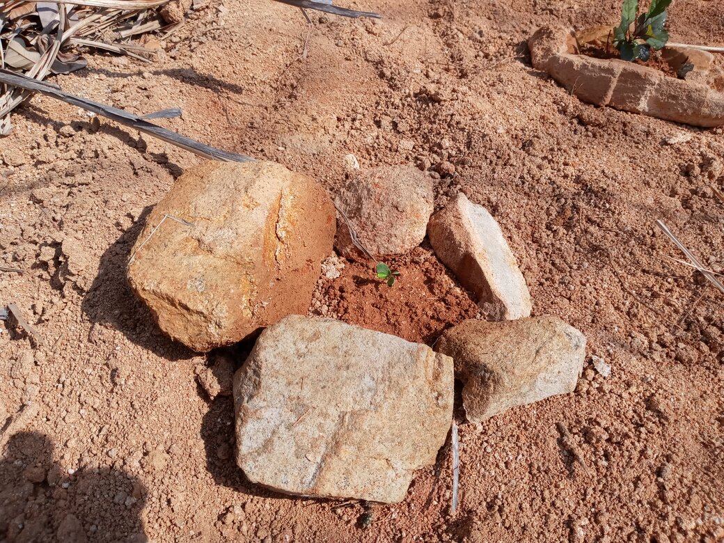 물로 씻어주고, 주변에 돌맹이들을 놓아서 흙이 튀는 걸 방지할 수 있게 해줬음.