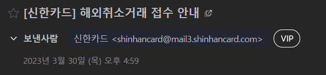 저녁에 이메일을 확인하는데 신한카드에서 해외취소거래 접수 안내` 내용의 메일이 있더라.