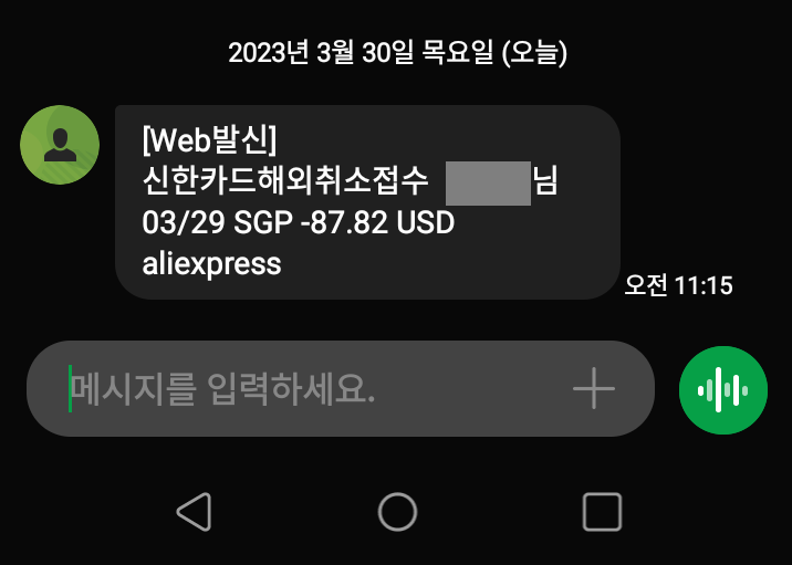 오전 11시 15분에 신한카드해외접수 문자가 도착했고, 아직 입금은 되지 않았다.