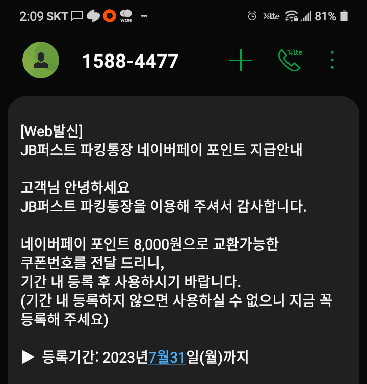 지급기준 : 포인트 지급일 기준, JB퍼스트 파킹통장 정상 계좌 보유고객이면서 전북은행 SMS(문자) 마케팅 수신동의 고객