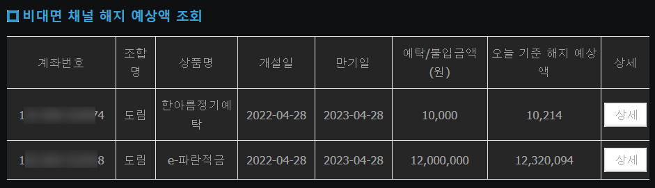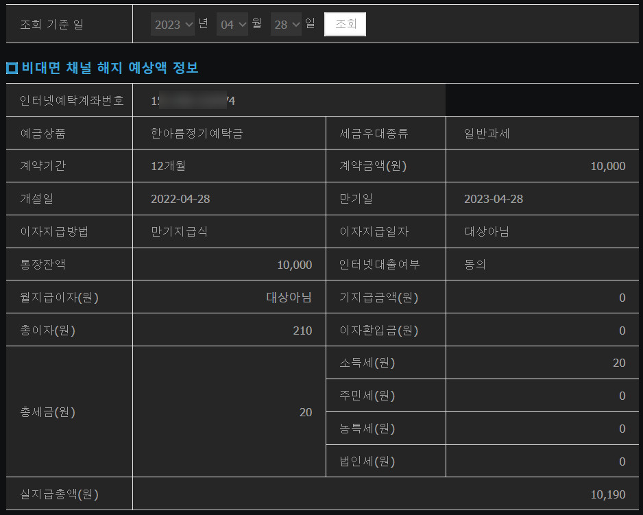 20일 계좌개설 제한 문제도 있었고, 딱히 가입할만한 예금상품이 보이지 않아서 즉시 해지는 하지 않았었음.