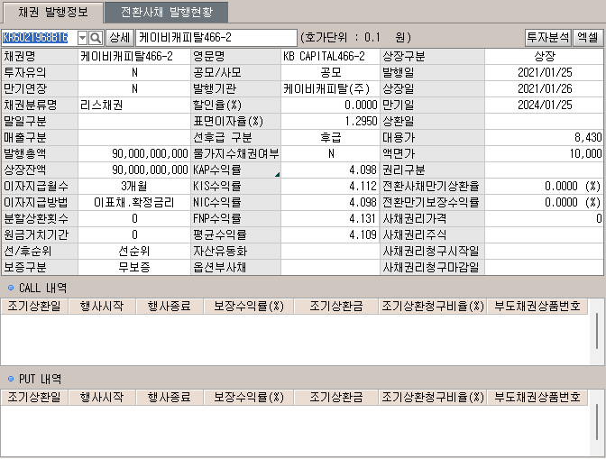 잔존기간, 수익율, 신용등급을 고려해서 `케이비캐피탈466-2`를 선택했음.