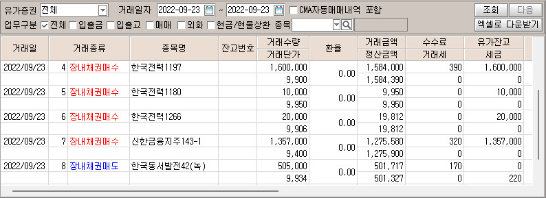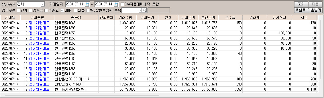 | [2023.07.18] 장내채권 매도 : 한국전력1273, 엔에이치투자60-2 외 3종목 (0) | 2023.07.18 |