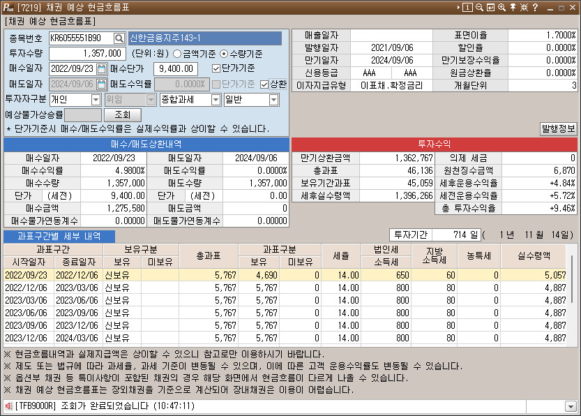 [2022.09.23] 장내채권 매수 : 신한금융지주143-1, AAA, 714일, 세후 4.84%