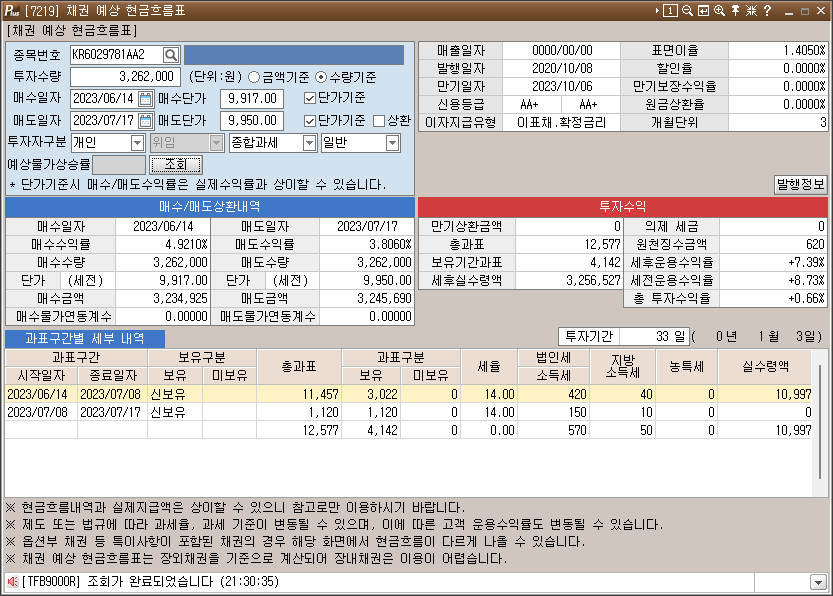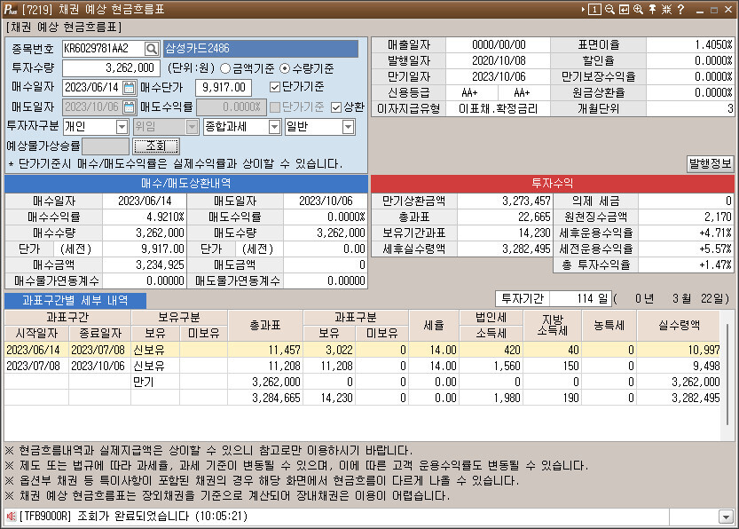 [2023.06.14] 장내채권 매수 : 삼성카드2486 (AA+ x 114일 x 세후 4.71% x 323만원)