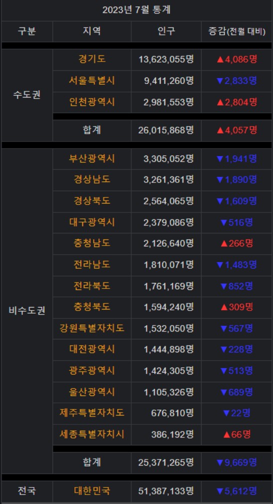 (공식속보!!!) 23년 7월 대한민국 인구통계.JPG - 부동산 갤러리