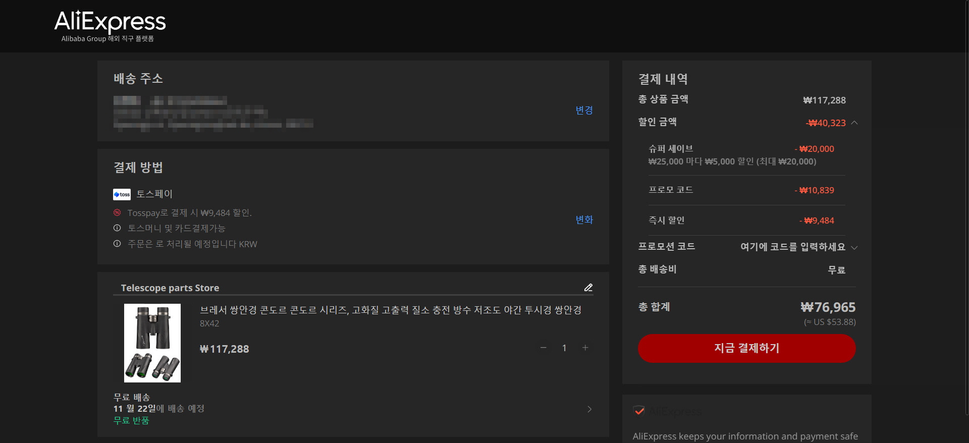 `죄송합니다, 해당 제품의 할인 코드가 이미 소진되었습니다. 다른 알리익스프레스 할인 코드를 즐겨보세요!`라는 메세지가 나와서 할인이 안 되더라.