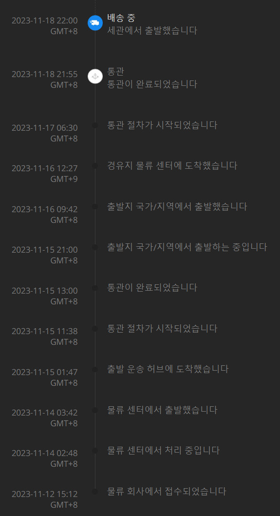 `배송추적`을 조회했을 때 `KR 세관`에서 출발하면 다음날 쯤에 도착하나 보더라.
