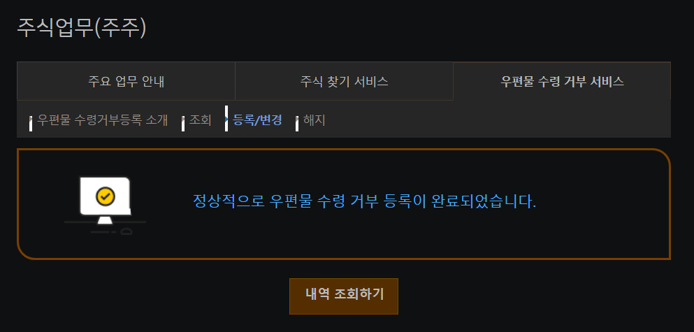 홈페이지 메뉴 : 조회 > 기타조회 > 증권대행업무 > 우편물수취거절