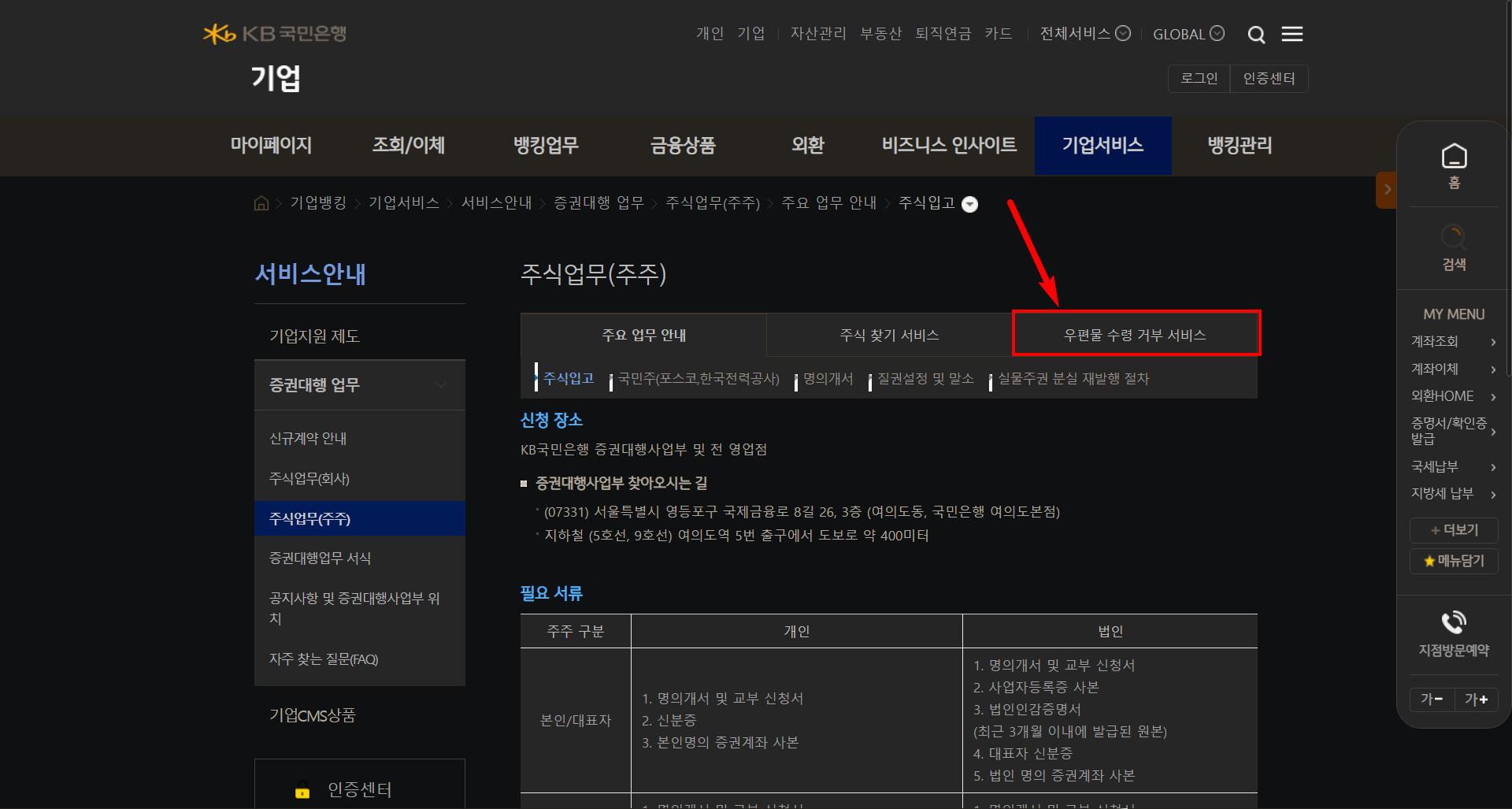 홈페이지 메뉴 : 기업 >> 기업서비스 >> 서비스안내 >> 증권대행 업무 >> 주식업무(주주) >> 우편물 수령 거부 서비스 >> 우편물 수령거부등록 소개