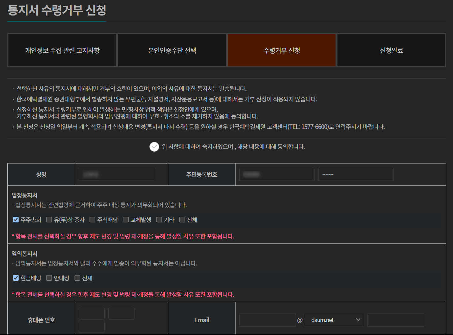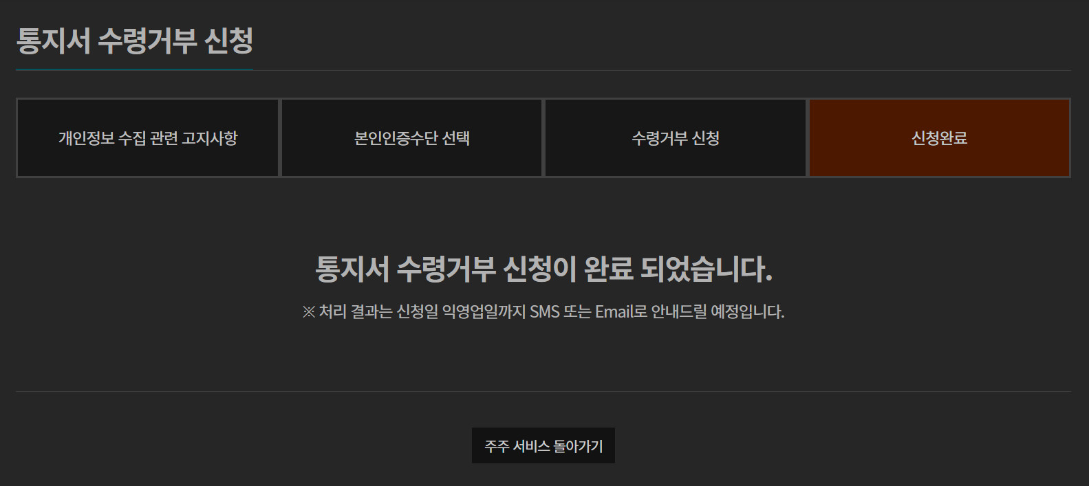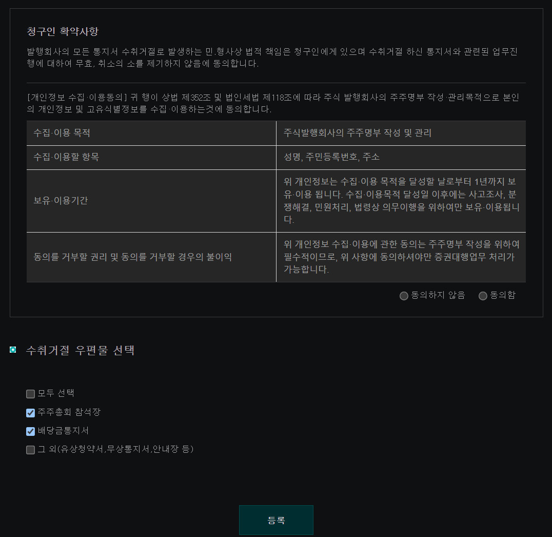 메뉴 : 주주서비스 >> 통지서 수령거부 신청 >> (화면 오른쪽) `수령거부 신청` 버튼 클릭