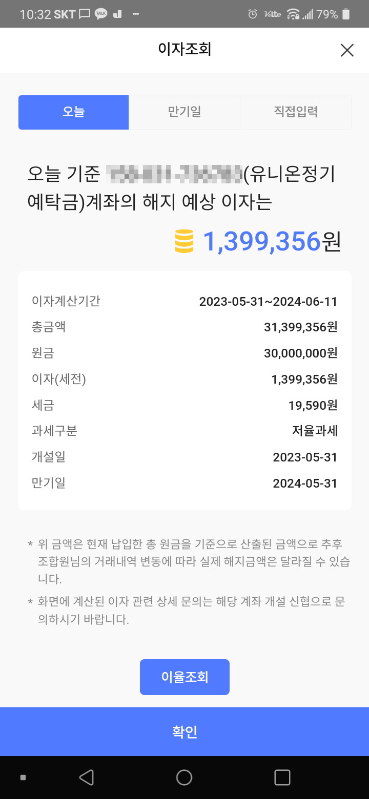 [2023.05.31] 정기예금 가입 : 남청주신협, 유니온정기예탁금 (4.55% x 12개월 x 3,000만원 x 저율과세)