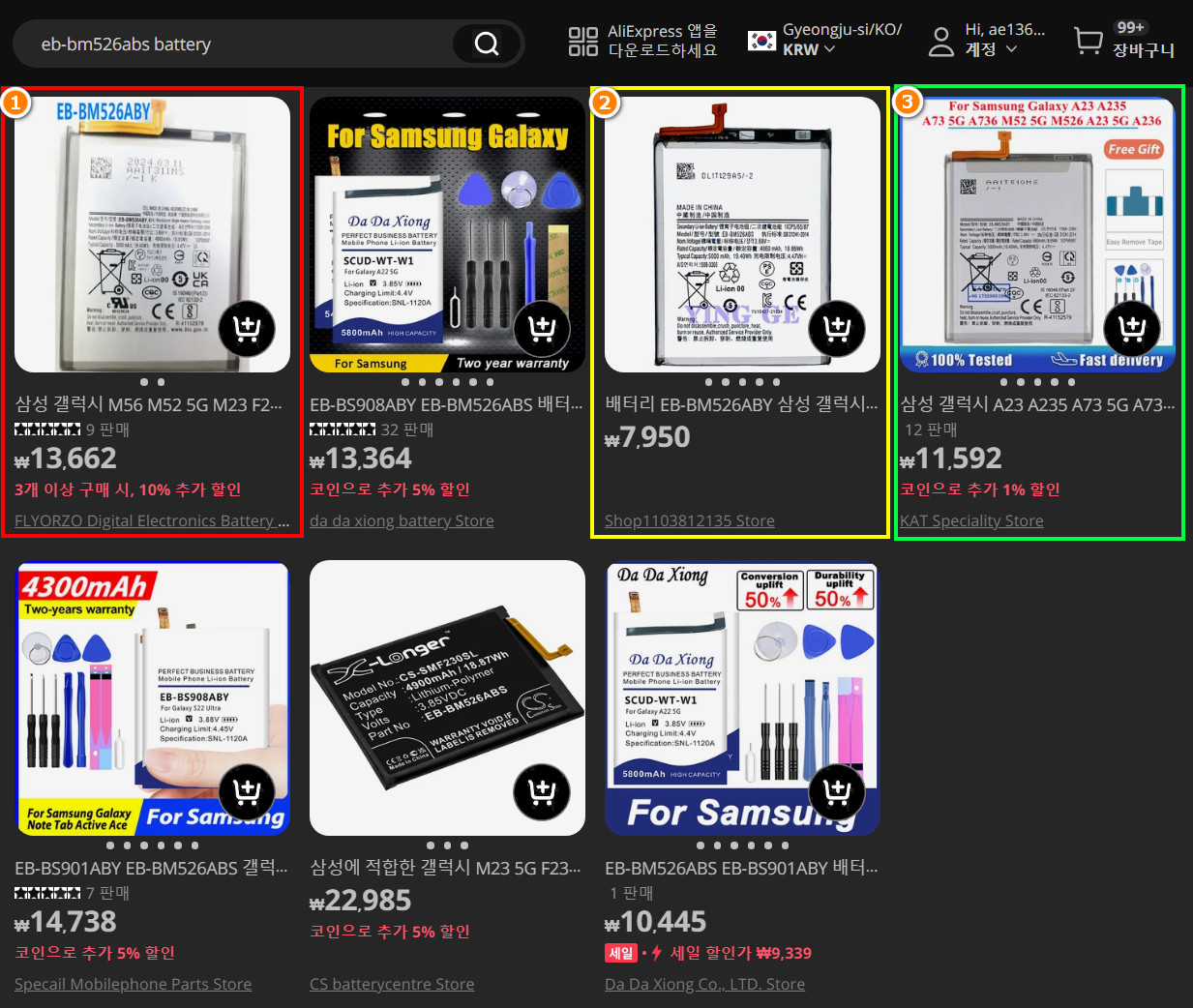 검색을 하면 여러가지가 나오는데 그 중에서도 본체에 장착되어 있는 배터리와 가장 유사한 것들만 모아 음