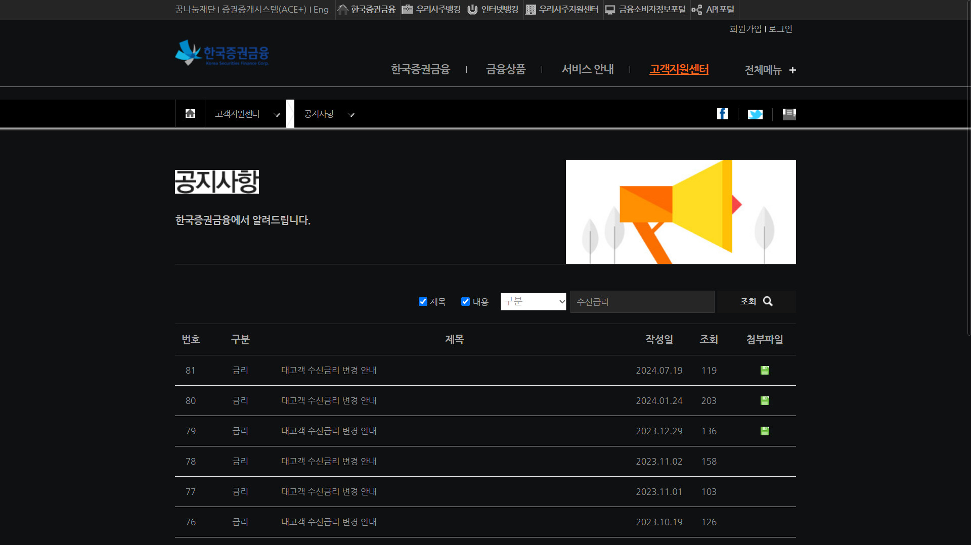 메뉴 : 고객지원센터 >> 공지사항 >> `수신금리` 검색 >> 최근 `대고객 수신금리 변경 안내` 클릭