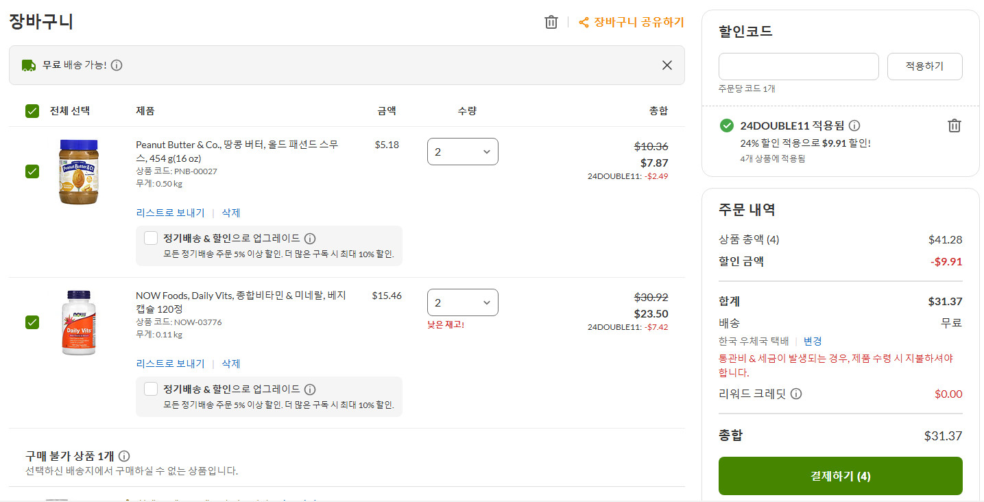 아이허브에서 종합비타민 2개와 땅콩버터 2개를 장바구니에 담아서 배송비를 무료로 만들고 주문완료!