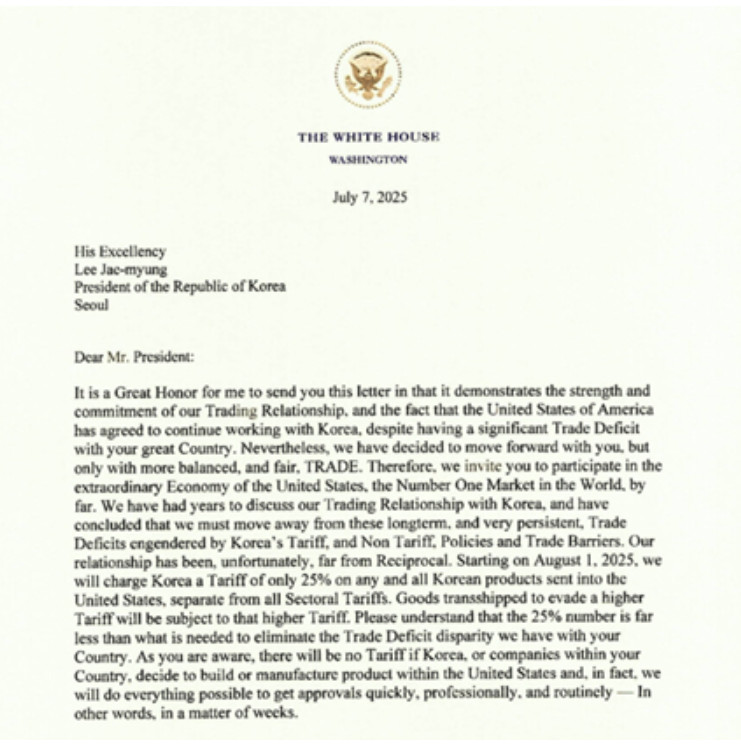 0708 트럼프, 이재명 대통령에 공개서한…"8월 1일부터 韓에 25% 관세"