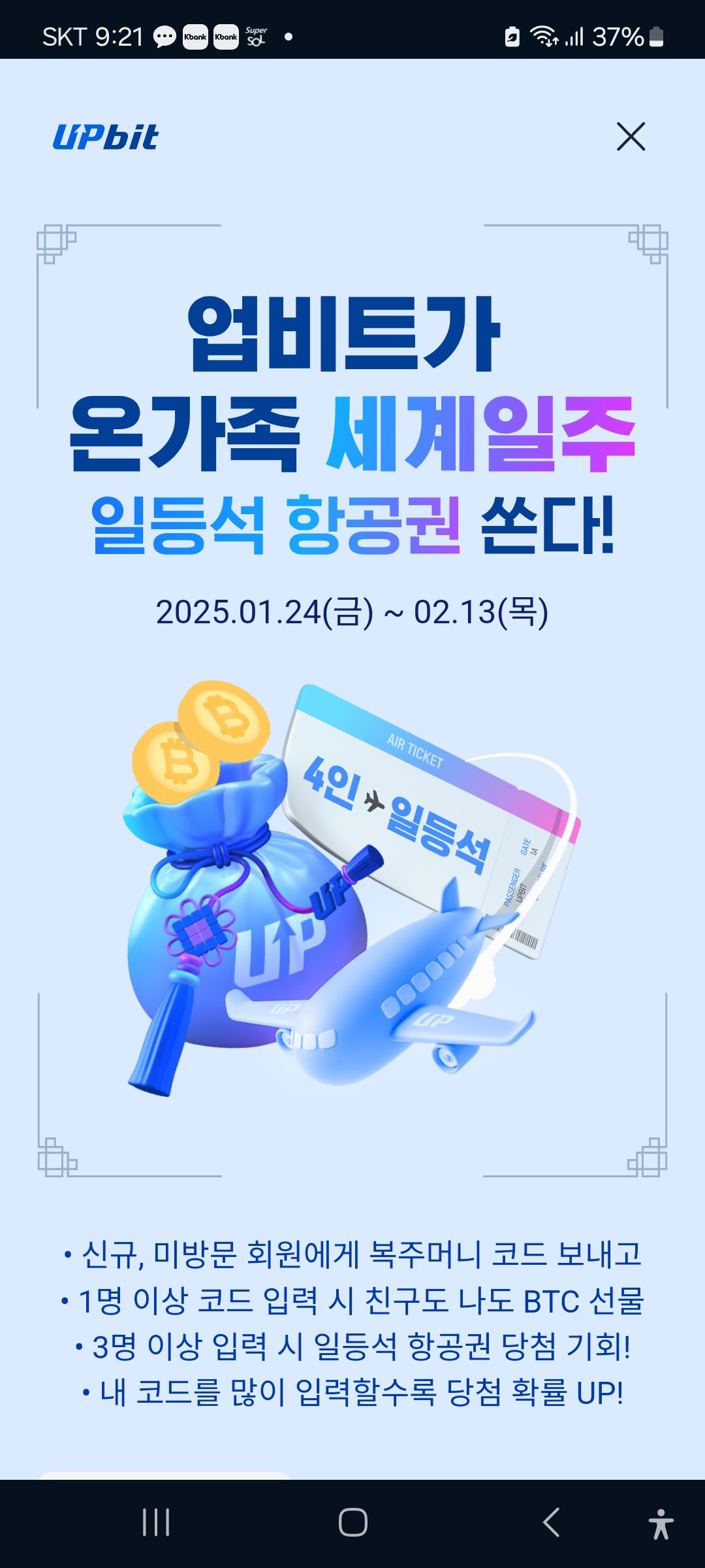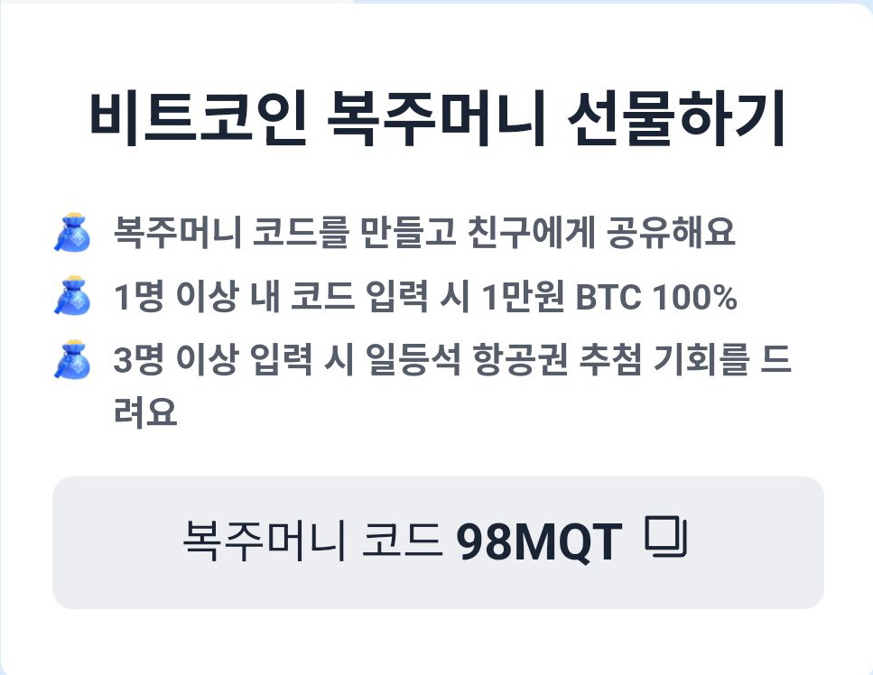 코드 입력하러 가기: https://upbit.onelink.me/dH32/3w3xu9wk?appScheme=%7B%22type%22%3A%22referral%22%2C%22referralCode%22%3A%2298MQT%22%2C%22uuid%22%3A%22a1c3200c-80ff-409d-a315-48ebe464cf92%22%7D