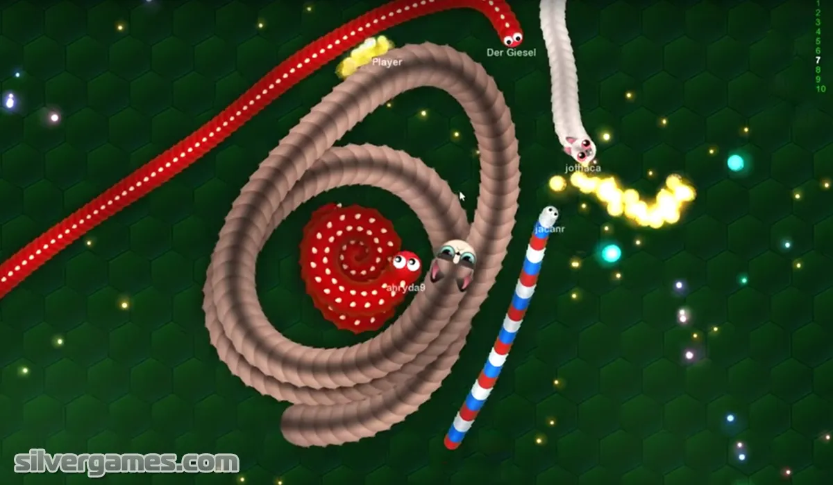 지렁이 머리가 다른 지렁이의 몸체에 닿으면 죽게 되고, 죽은 지렁이는 구체를 남기게 되는데 그걸 먹는 지렁이는 성장하는 게임.