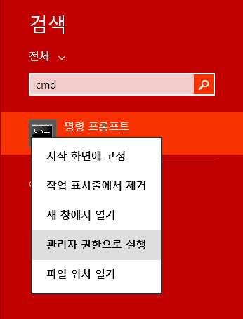 cmd (명령 프롬프트)를 `관리자 권한으로 실행` 한다.
