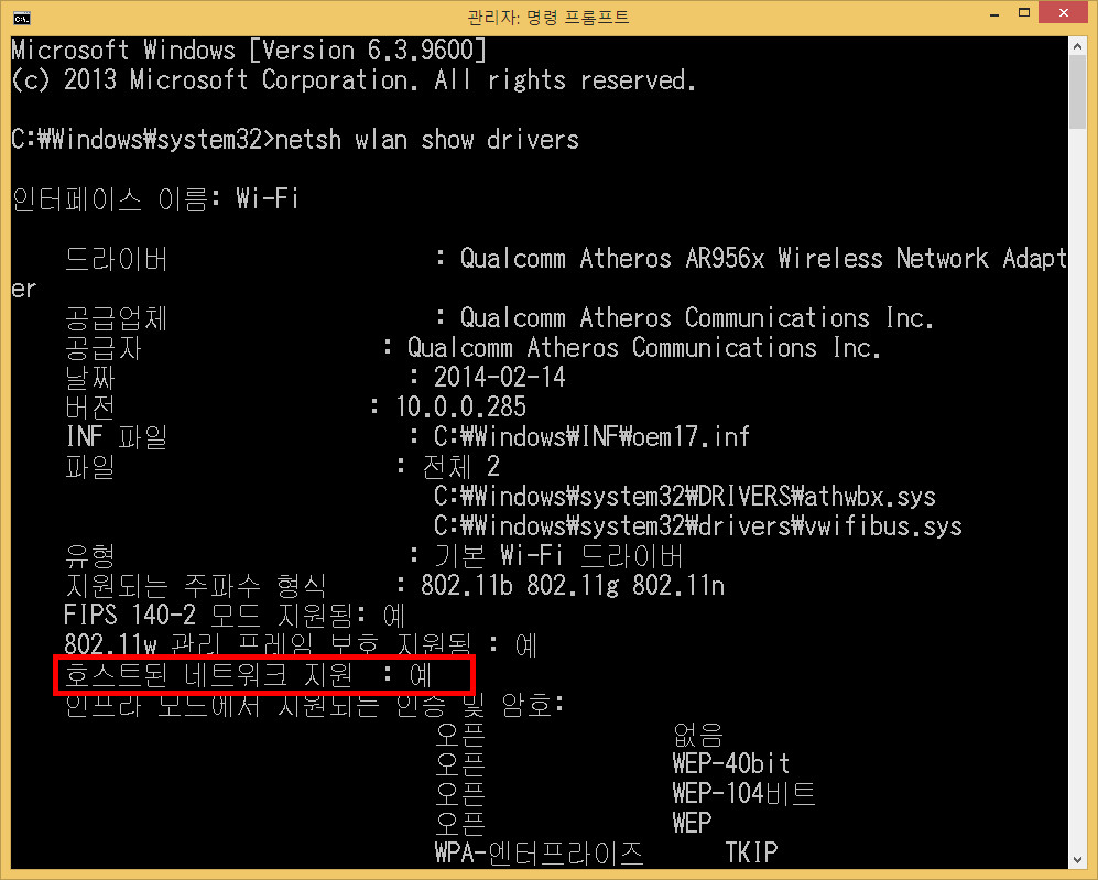 "호스트된 네트워크 지원 : 예" 라고 나와야 핫스팟을 구성할 수 있습니다. ★★★