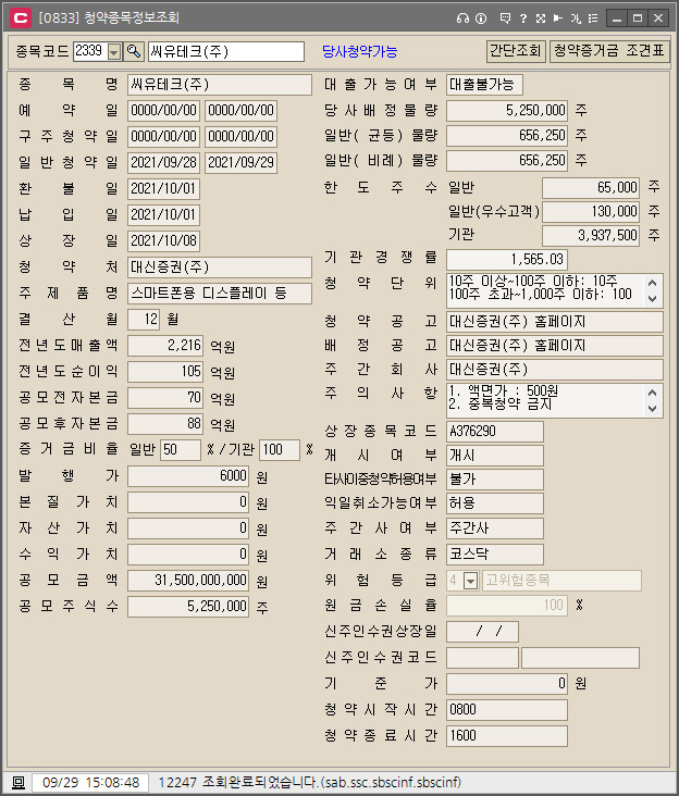 [2021.09.29] 씨유테크 공모주 청약