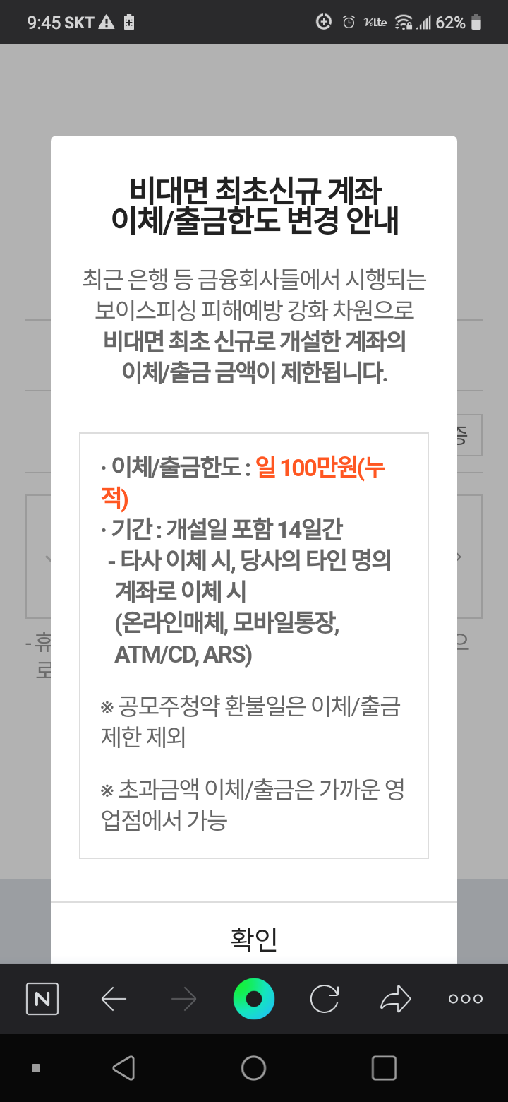 14일간 이체한도 일 100만원 제한이 있음.